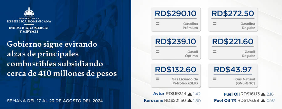 Para la semana del 17 al 23 de agosto 2024, el Ministerio de Industria, Comercio y MiPymes dispone que los combustibles se comercialicen a los siguientes precios: