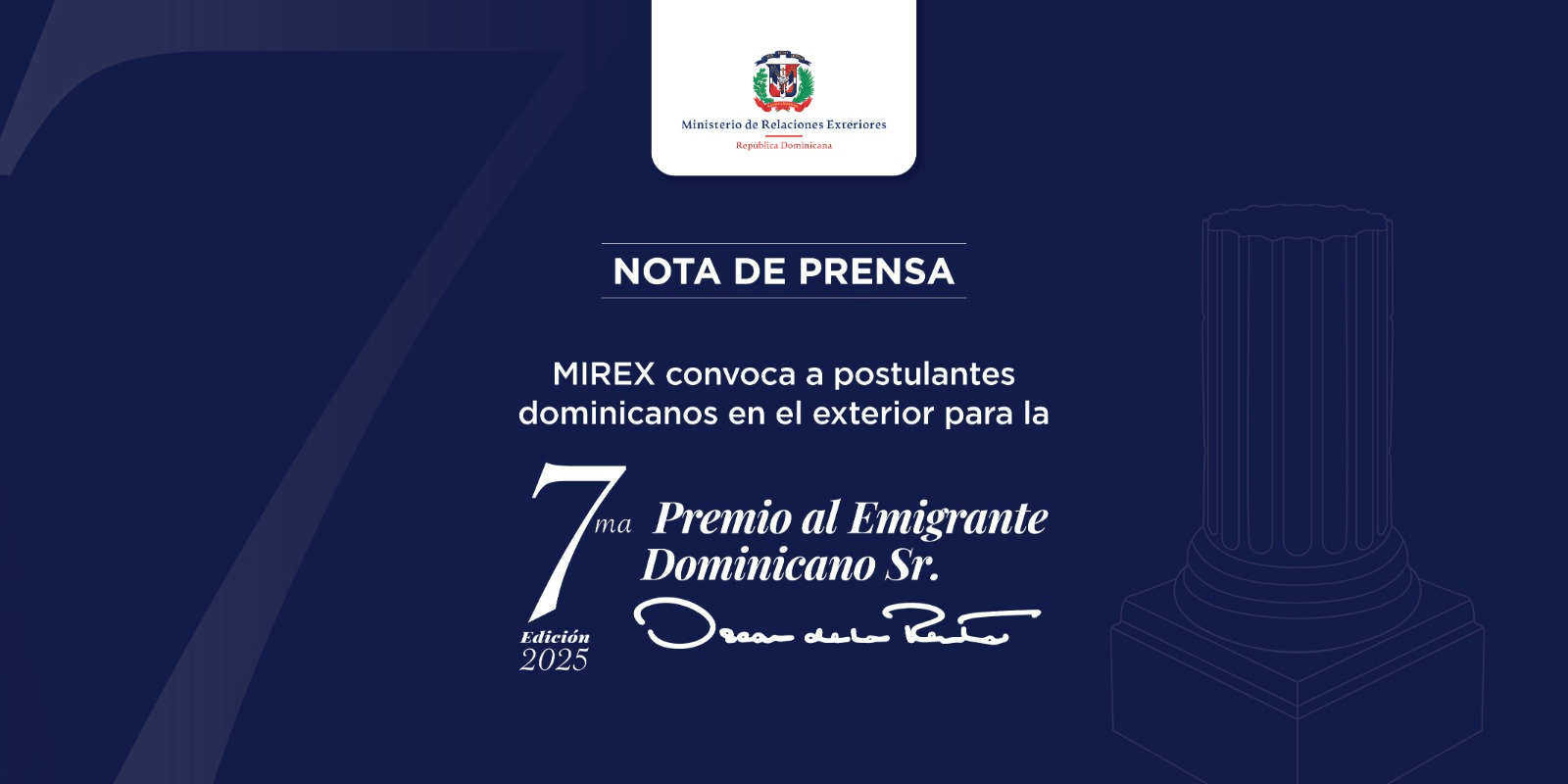 Santo Domingo de Guzmán, República Dominicana.– A partir de este viernes 4 de abril, el Ministerio de Relaciones Exteriores (MIREX) dejó abierta la convocatoria para la postulación de dominicanas y dominicanos residentes en el exterior a la 7ma. edición del Premio al Emigrante Dominicano Sr. Oscar de la Renta, una premiación que reconoce los aportes que dejan huellas positivas en las comunidades donde se radican, así como en República Dominicana.